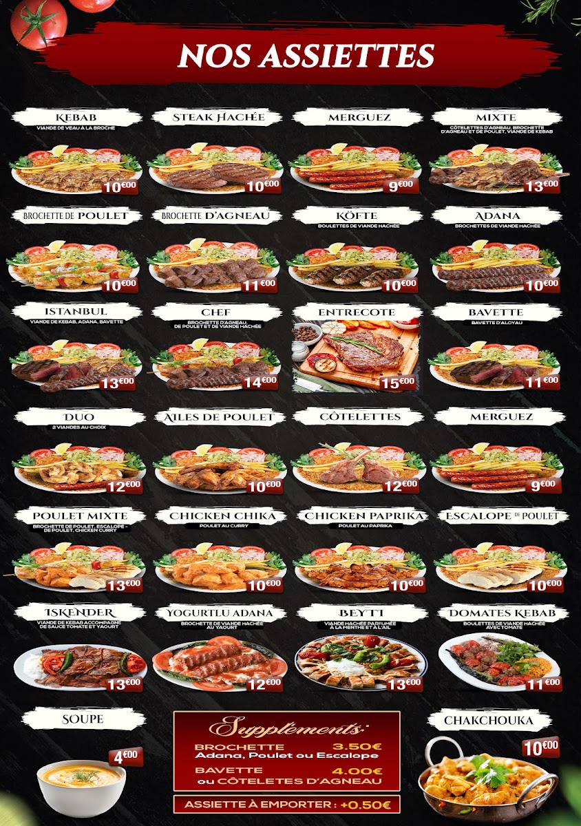 You’ll find a variety of grilled meats like Adana Kebab and Brochettes de Poulet, alongside lighter choices such as fresh salads and soups. Dishes like the Grillades Mixtes or the Duo Poulet et Agneau are perfect for those looking to savor a bit of everything, making it easy to enjoy a relaxed lunch or dinner with friends and family.